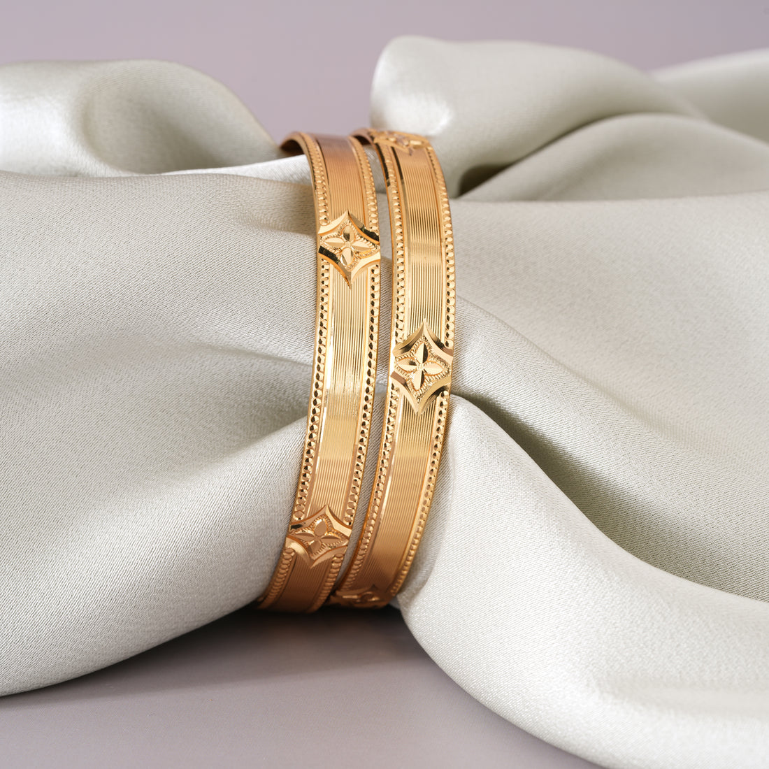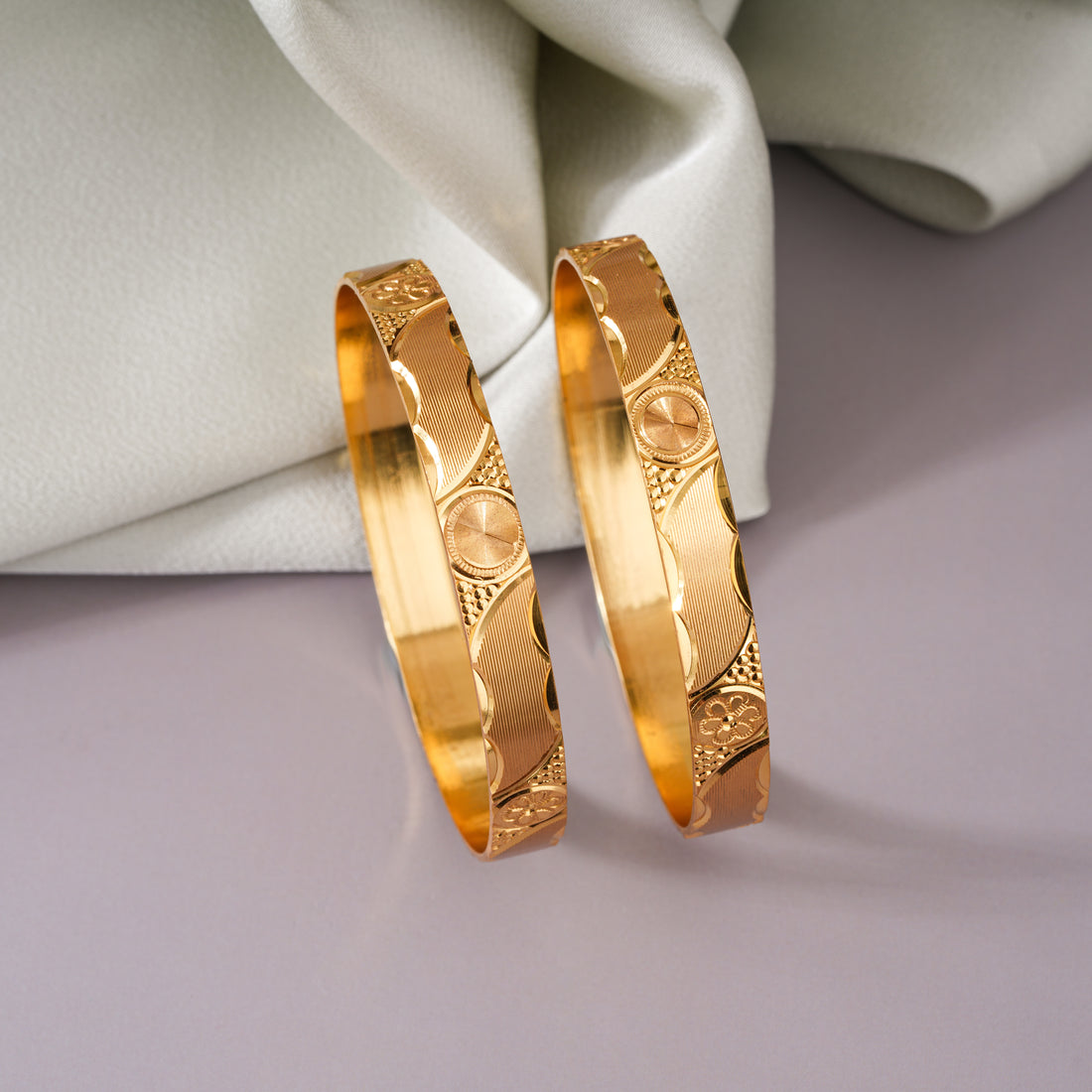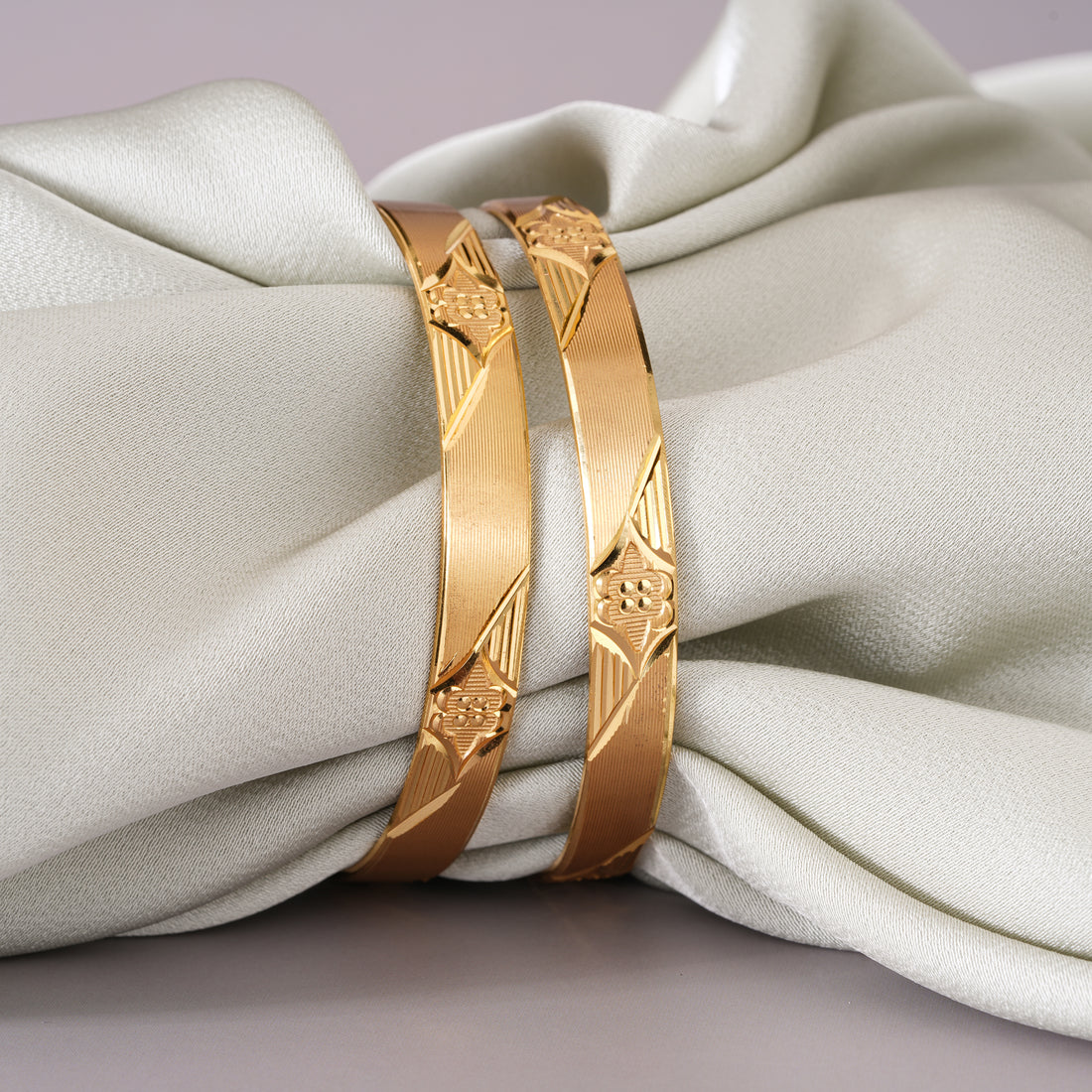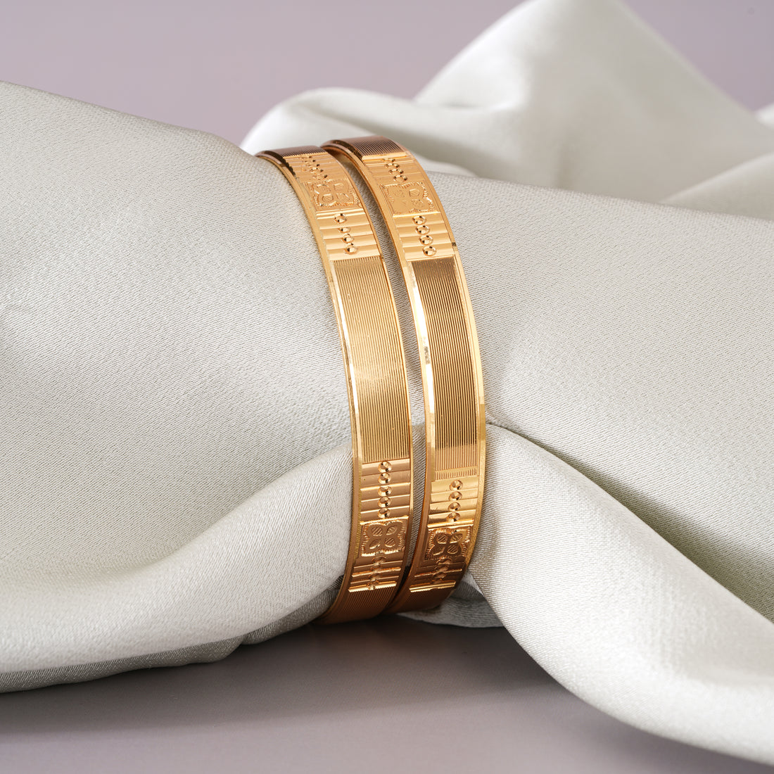 Set of Two 24 Carat gold-plated handcrafted bangles, each has an intricate textured pattern, slip-on...