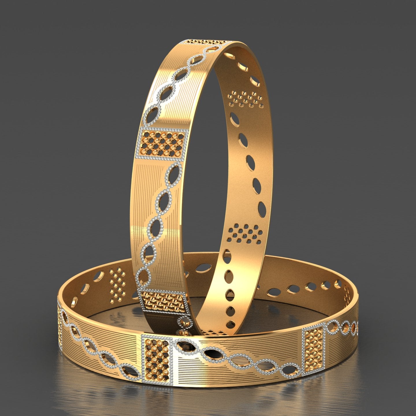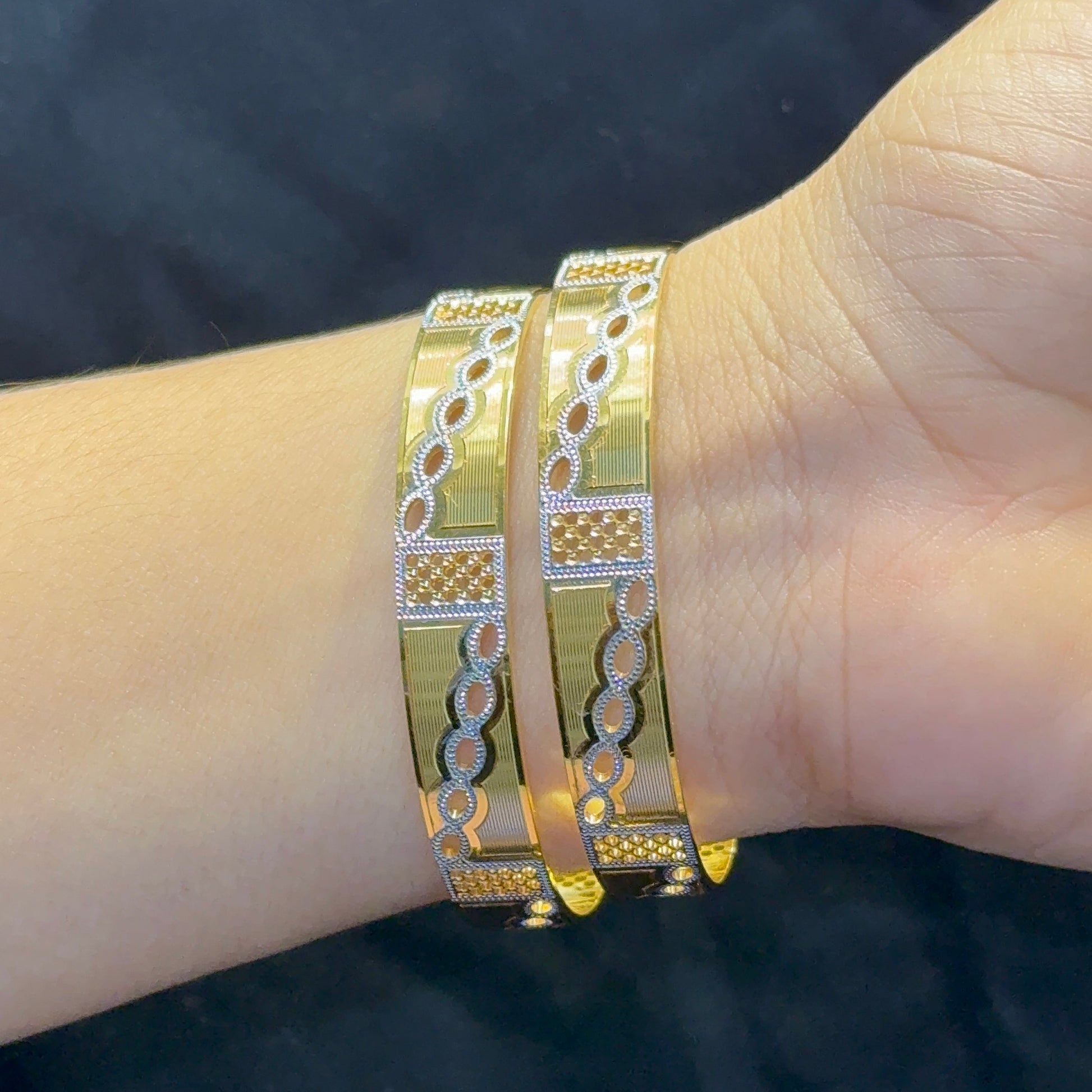 Set of Two 24 Carat gold-plated handcrafted bangles, each has an intricate textured pattern, slip-on closure