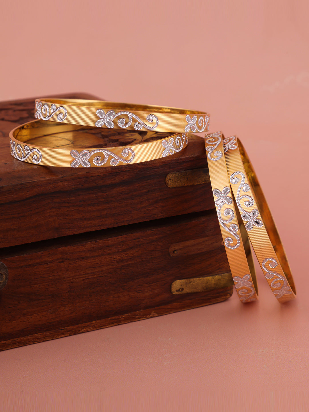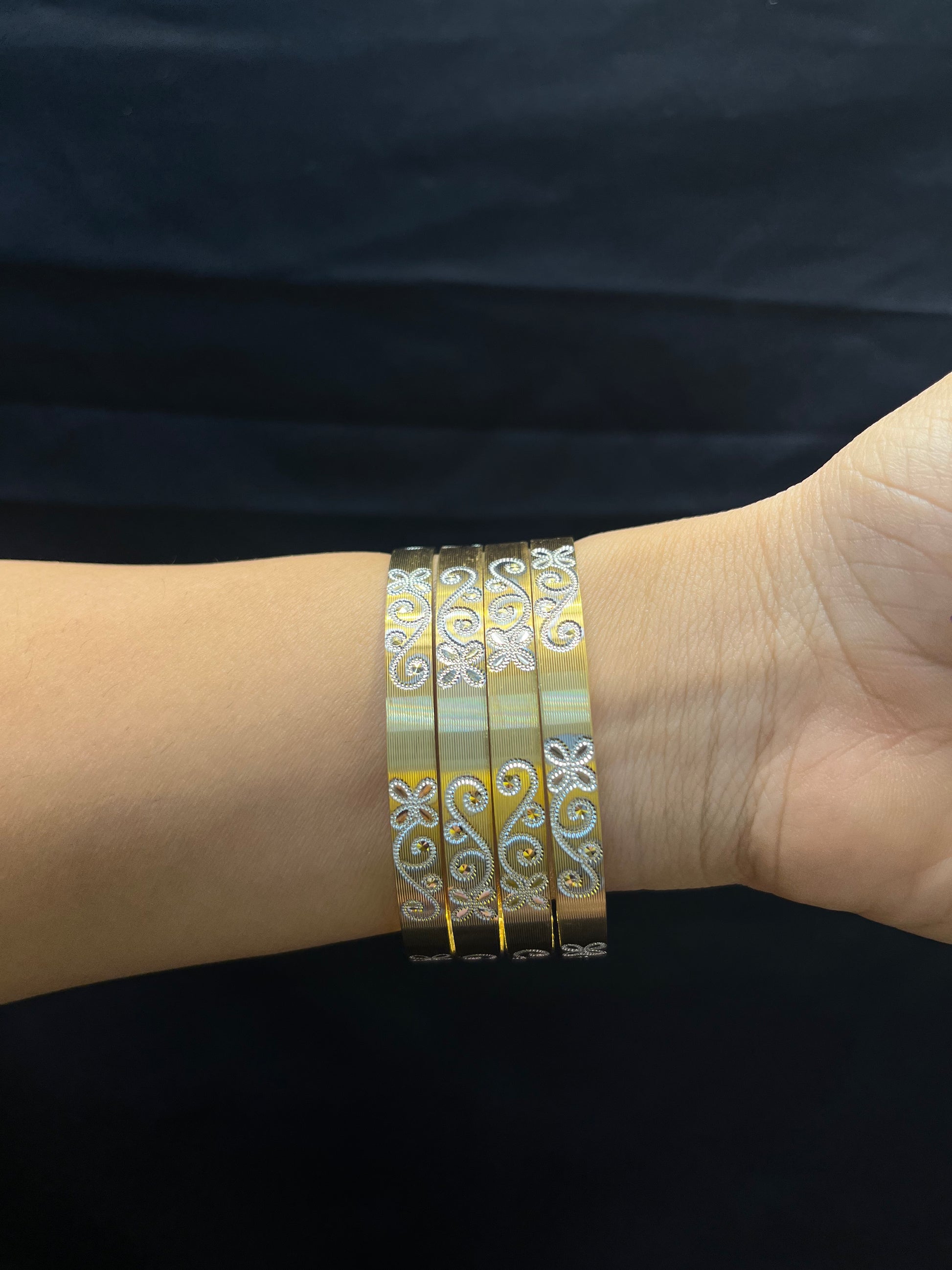 Set of Four 24 Carat gold-plated handcrafted bangles, each has an intricate textured pattern, slip-on closure