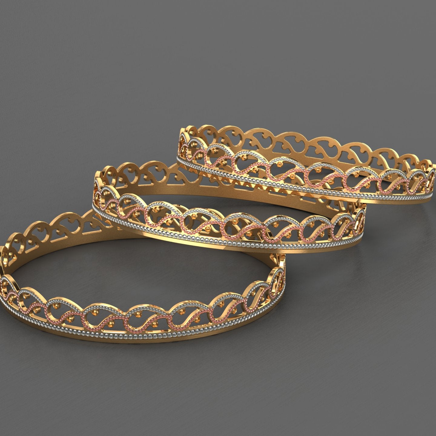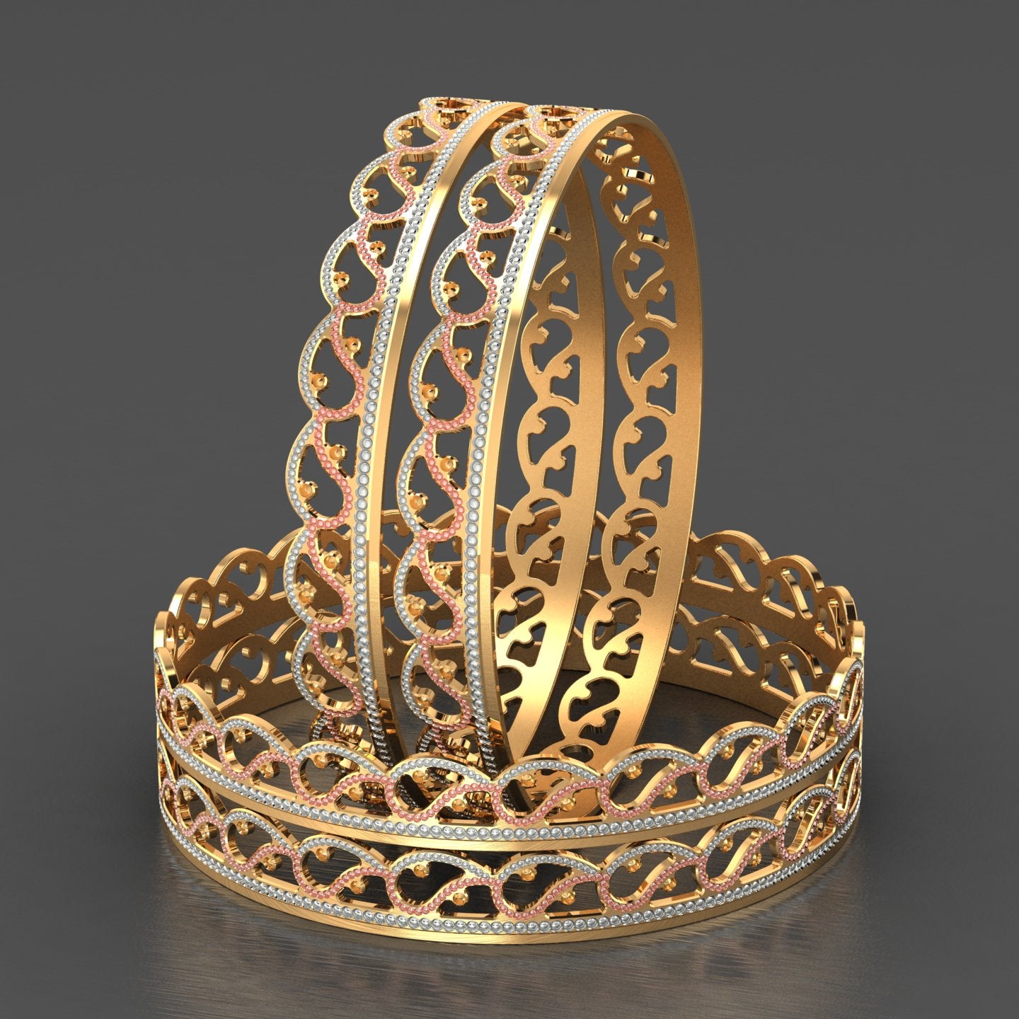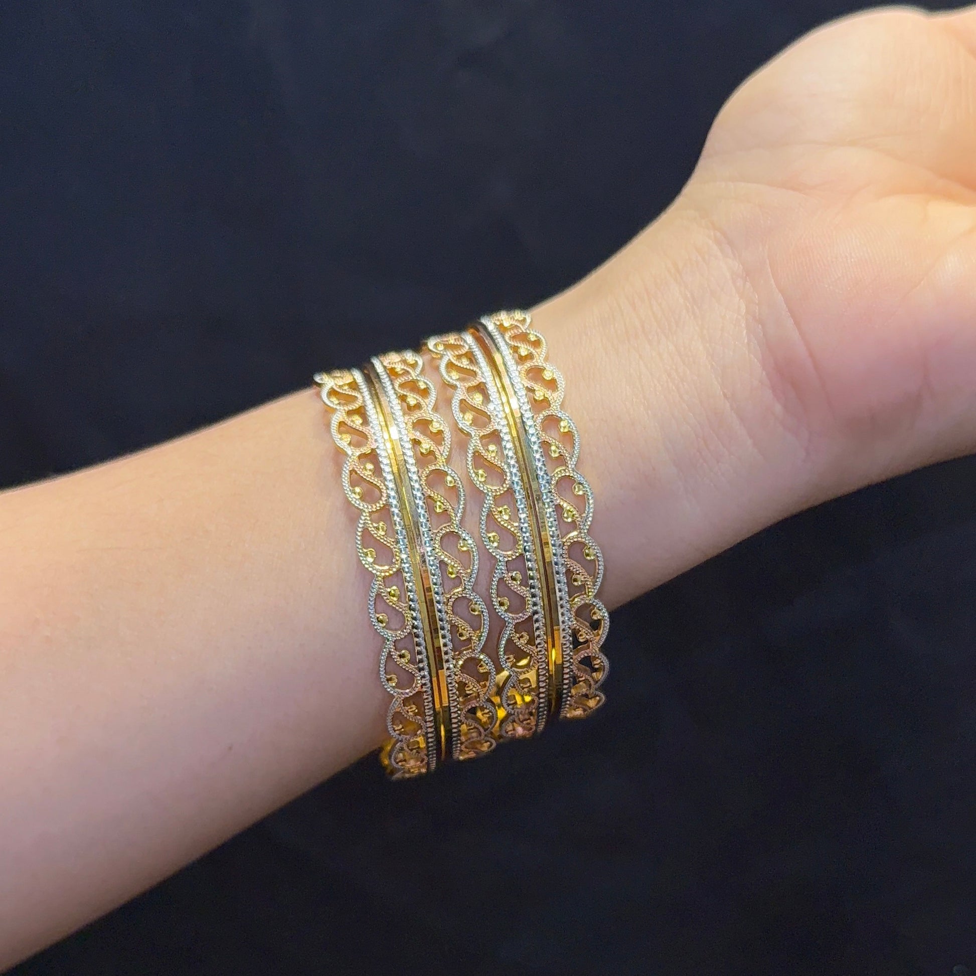 Set of Four 24 Carat gold-plated handcrafted bangles, each has an intricate textured pattern, slip-on closure