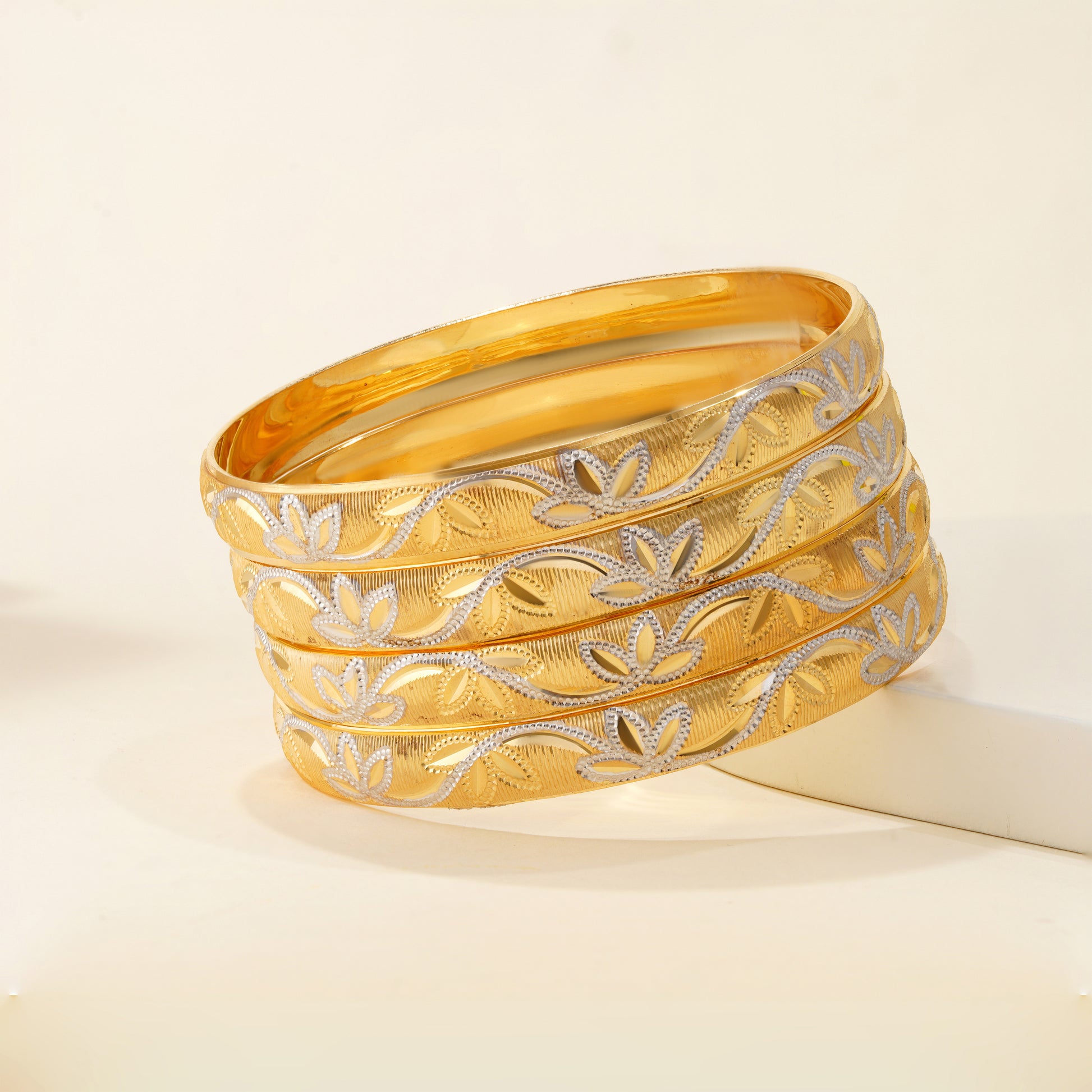 Set of Four 24 Carat gold-plated handcrafted bangles, each has an intricate textured pattern, slip-on closure