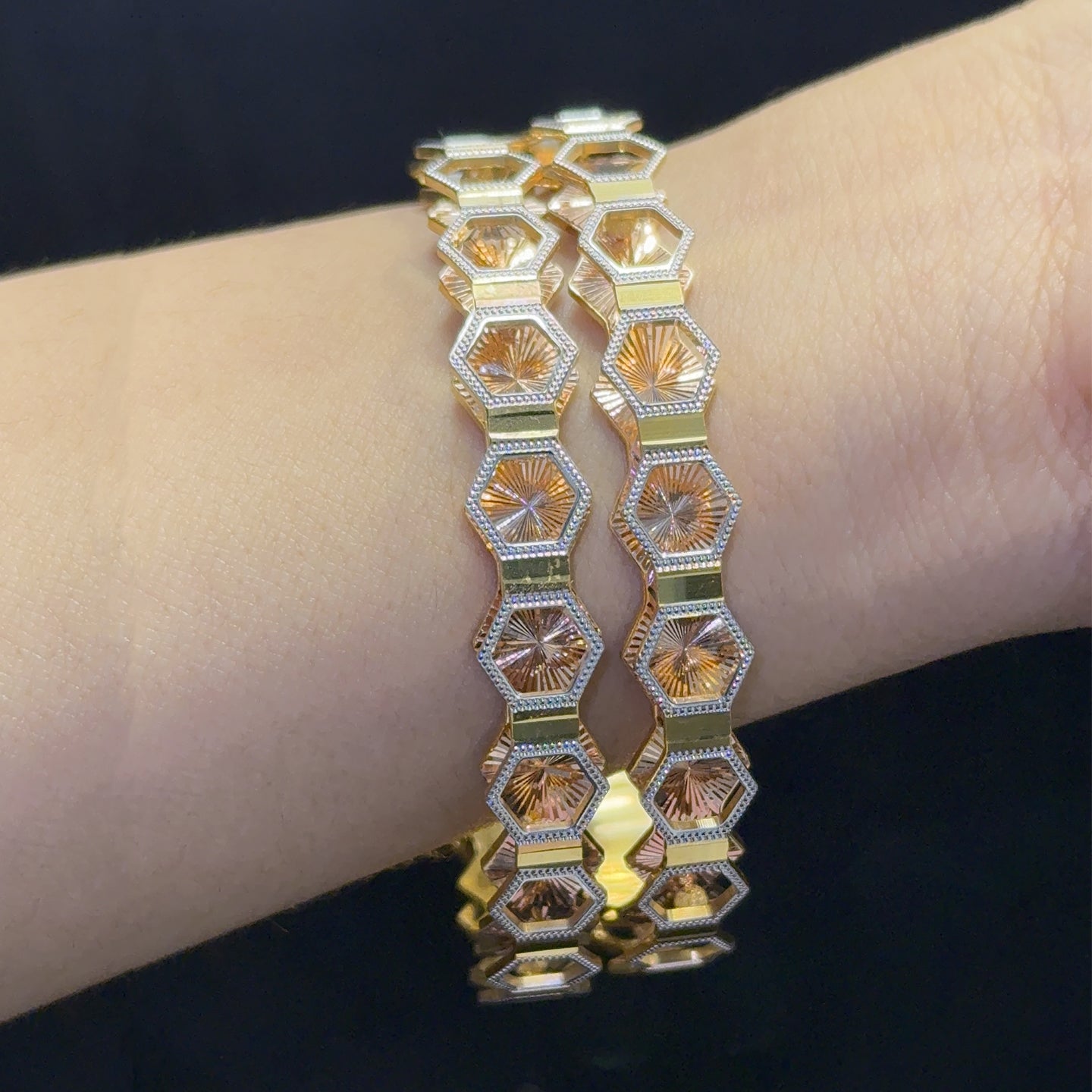 Set of Two 24 Carat gold-plated handcrafted bangles, each has an intricate textured pattern, slip-on closure