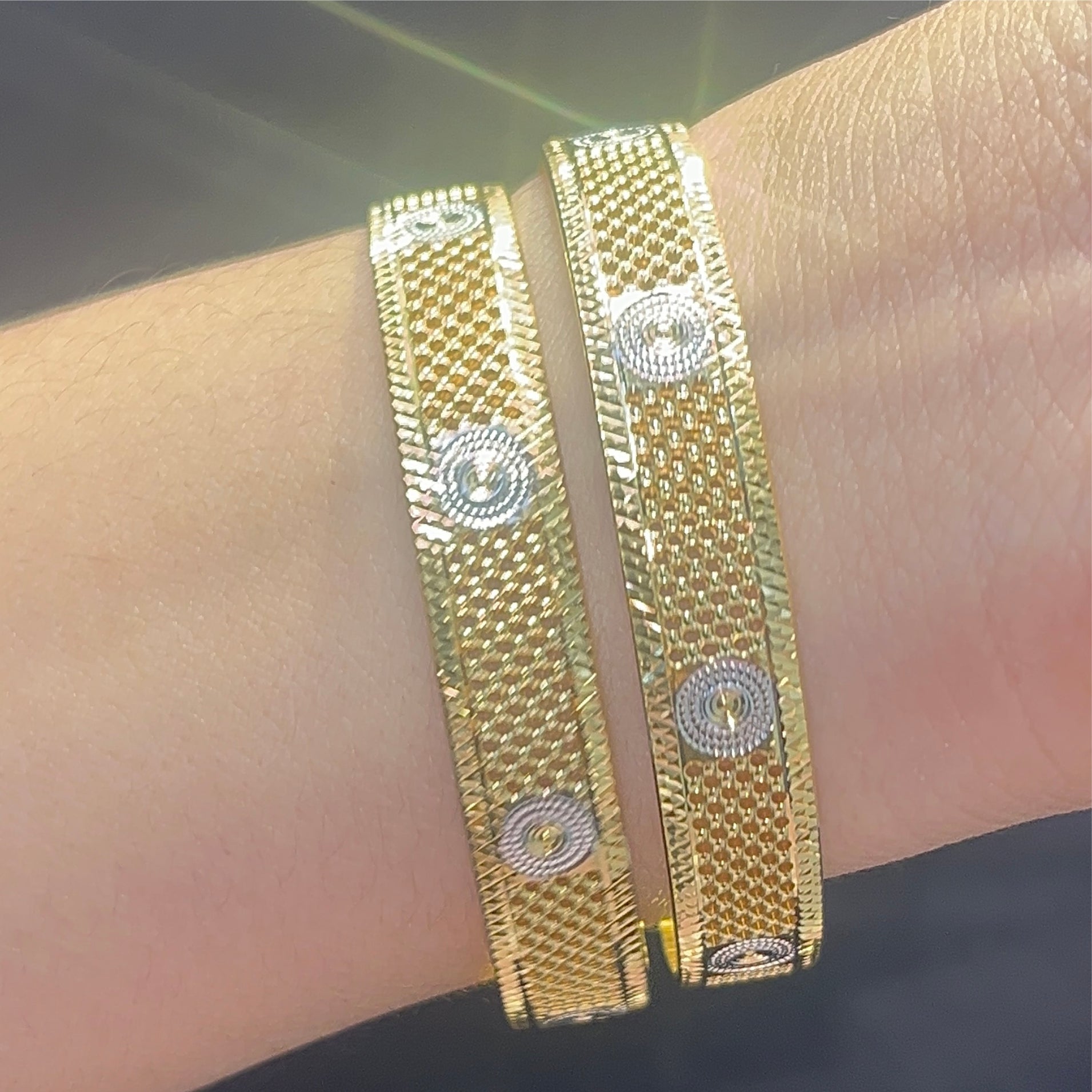 Set of Two 24 Carat gold-plated handcrafted bangles, each has an intricate textured pattern, slip-on closure