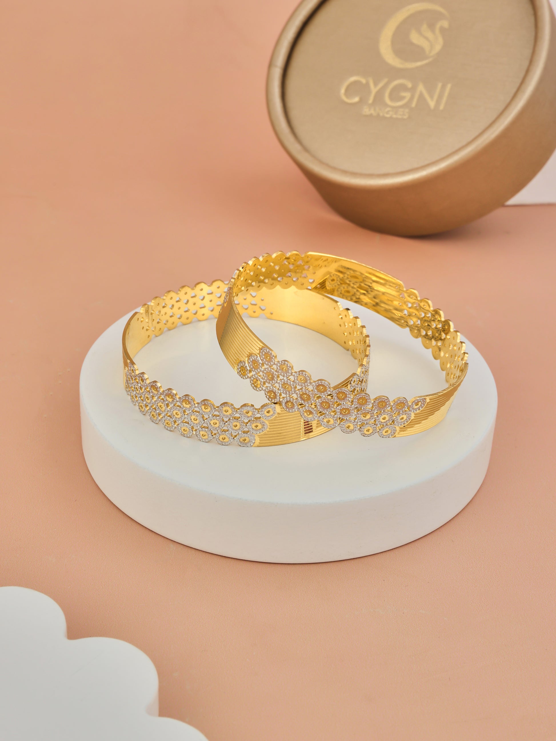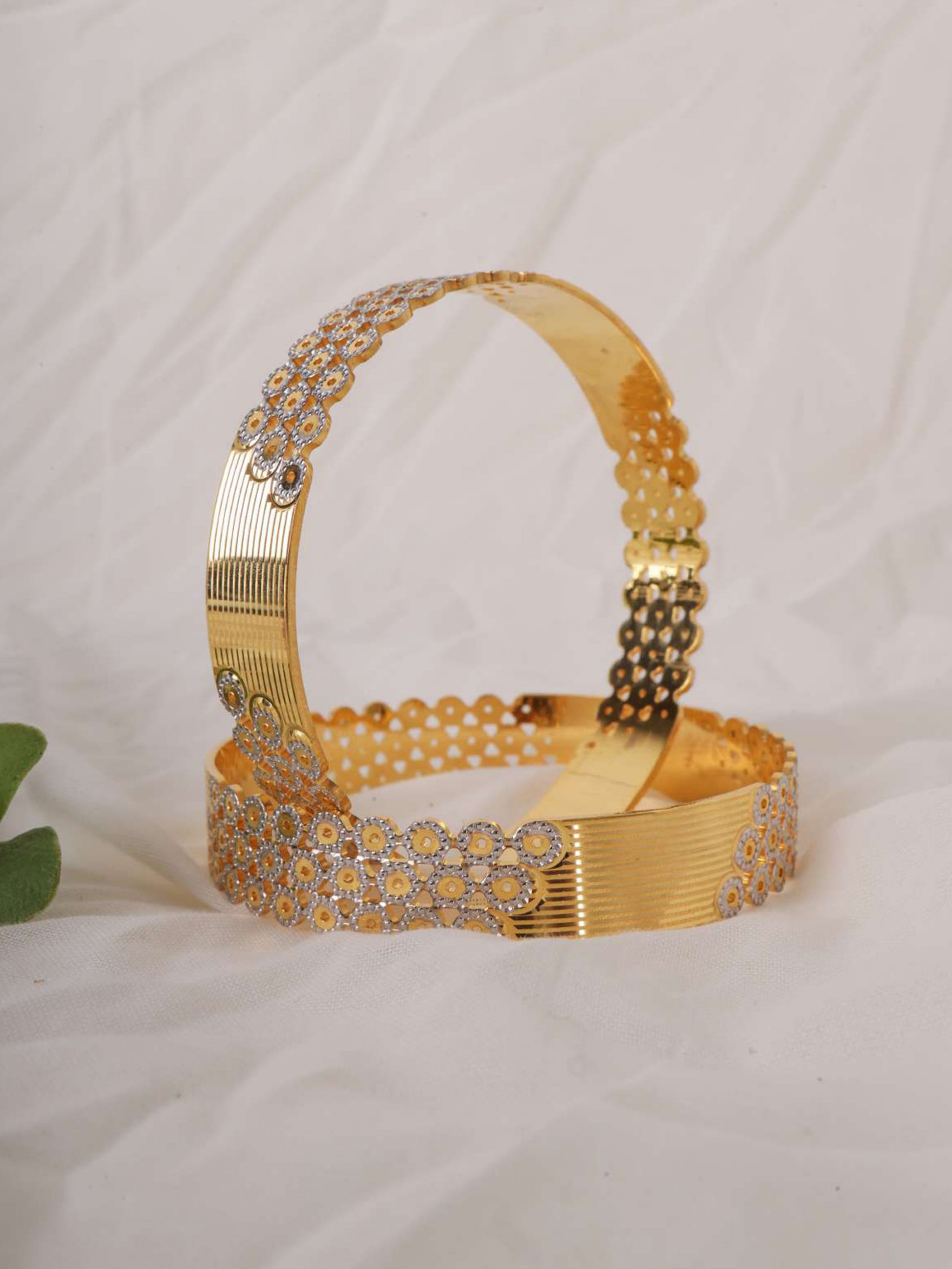 Set of Two 24 Carat gold-plated handcrafted bangles, each has an intricate textured pattern, slip-on closure