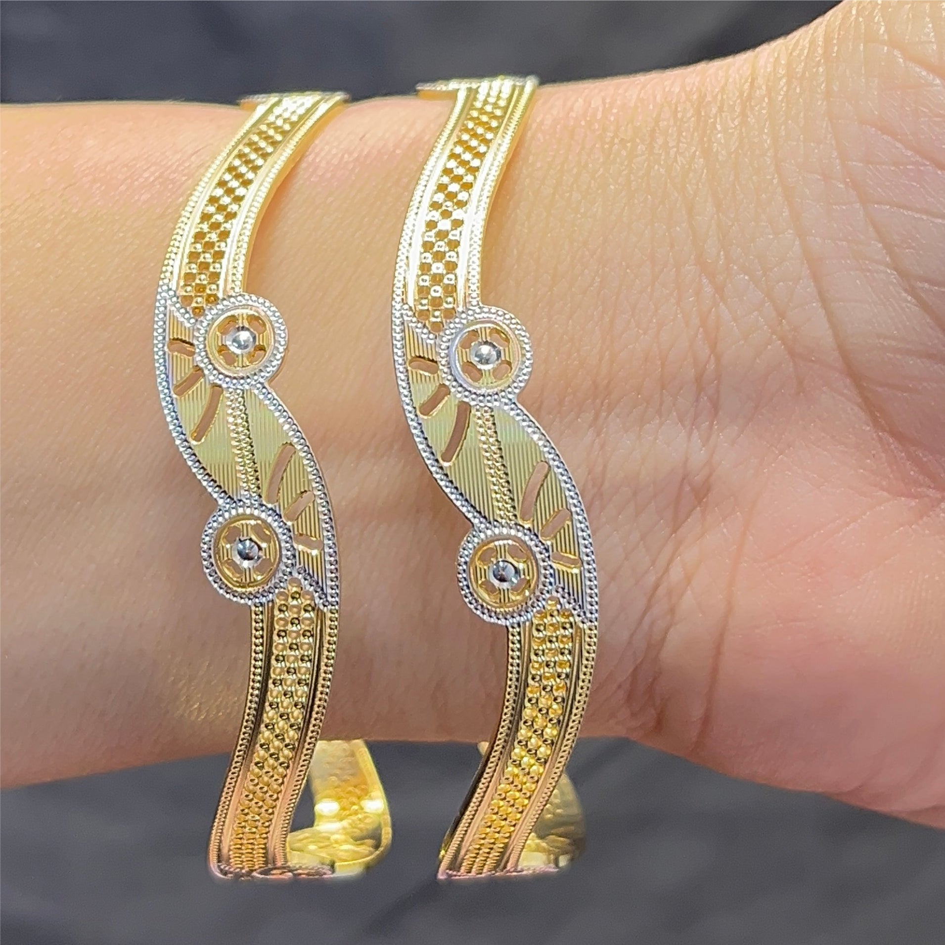Set of Two 24 Carat gold-plated handcrafted bangles, each has an intricate textured pattern, slip-on closure