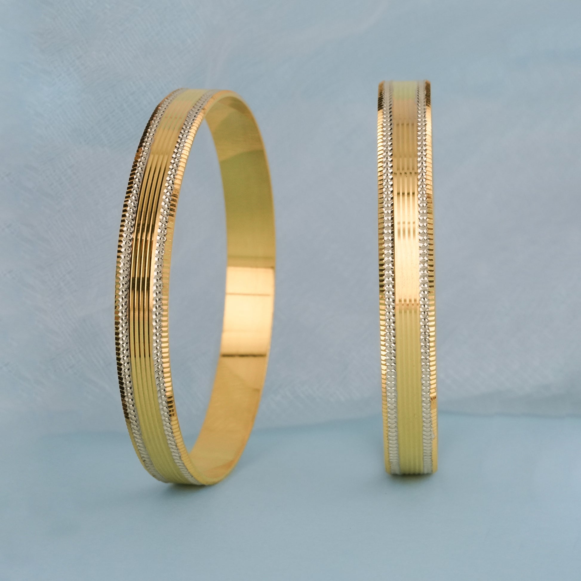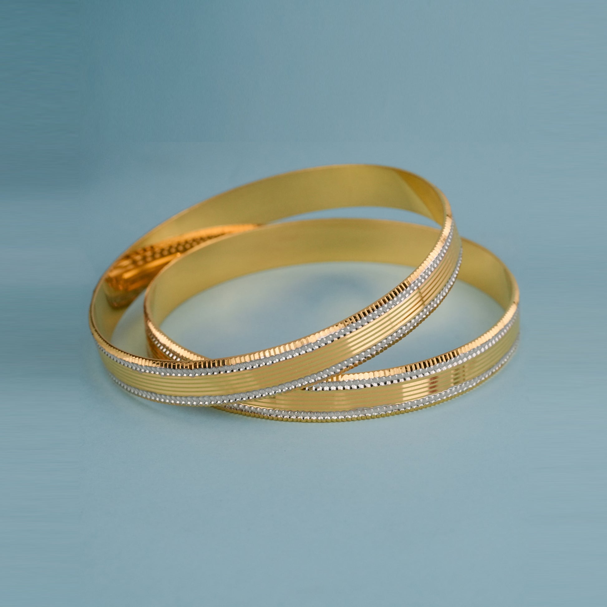 Perfect for daily wear or special moments, this set of two gold-plated bangles features a subtle yet intricate textured design that complements any outfit. Crafted from brass with elegant 24-carat gold plating, these bangles offer lasting shine and comfort. The easy slip-on closure makes them a go-to accessory for effortless elegance.