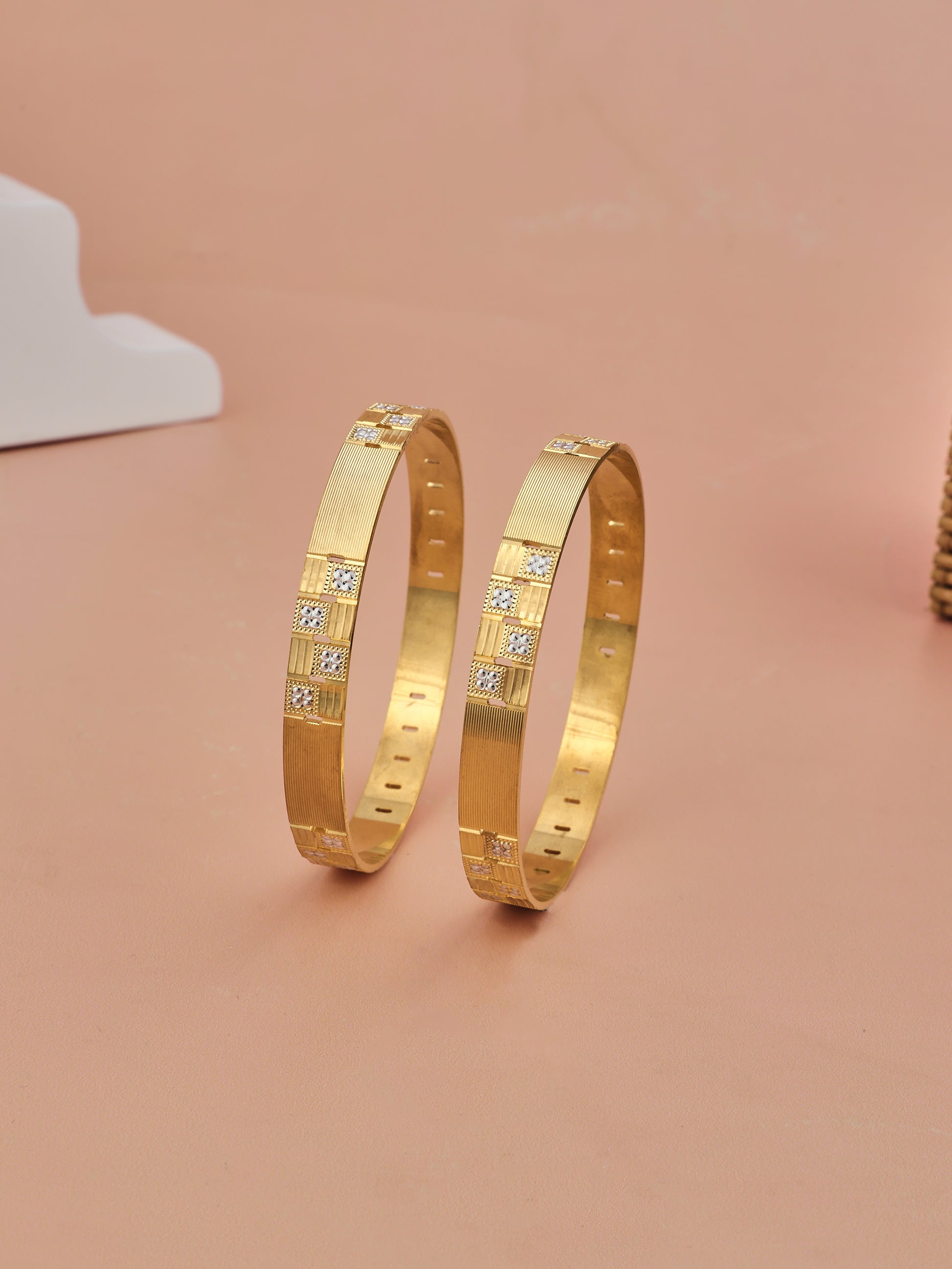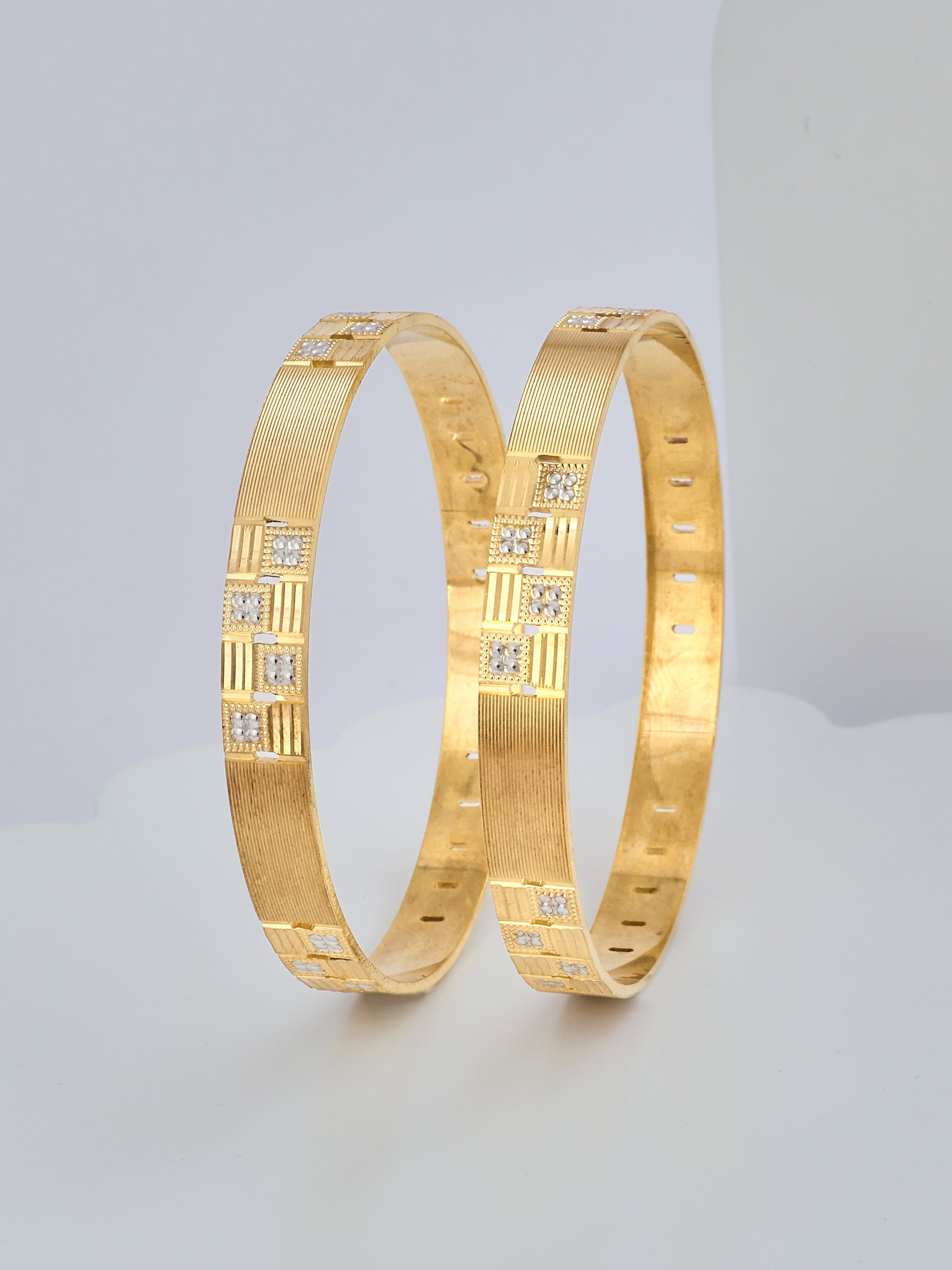 Set of Two 24 Carat gold-plated handcrafted bangles, each has an intricate textured pattern, slip-on closure