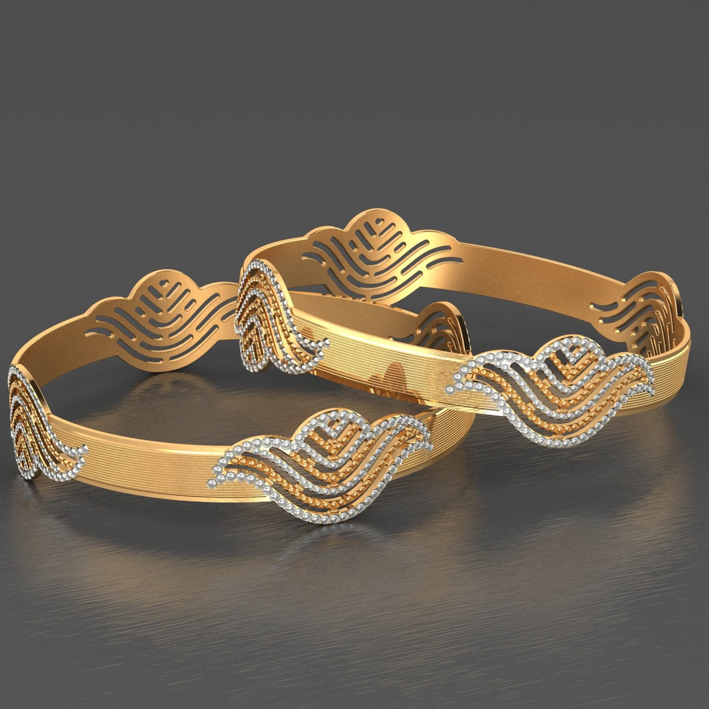 Set of Two 24 Carat gold-plated handcrafted bangles, each has an intricate textured pattern, slip-on closure
