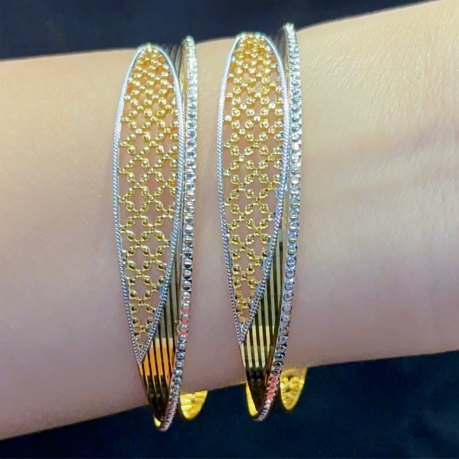 Set of Two 24 Carat gold-plated handcrafted bangles, each has an intricate textured pattern, slip-on closure