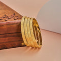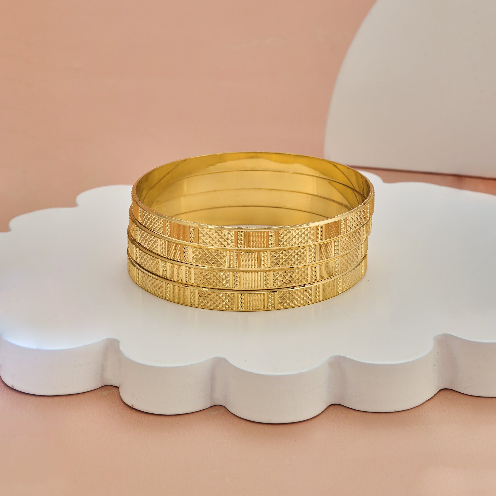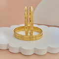 Perfect for daily wear or special moments, this set of two gold-plated bangles features a subtle yet intricate textured design that complements any outfit. Crafted from brass with elegant 24-carat gold plating, these bangles offer lasting shine and comfort. The easy slip-on closure makes them a go-to accessory for effortless elegance.
