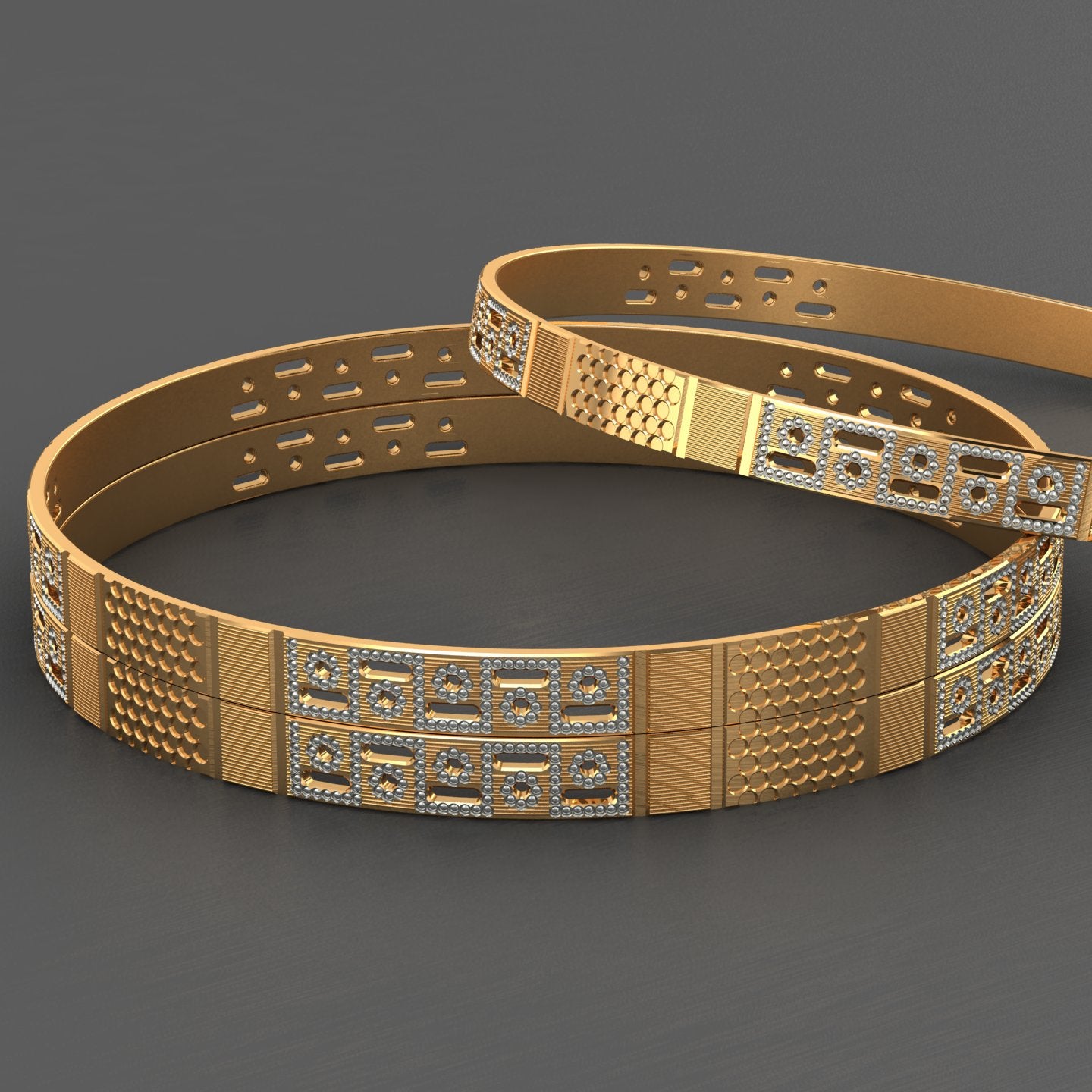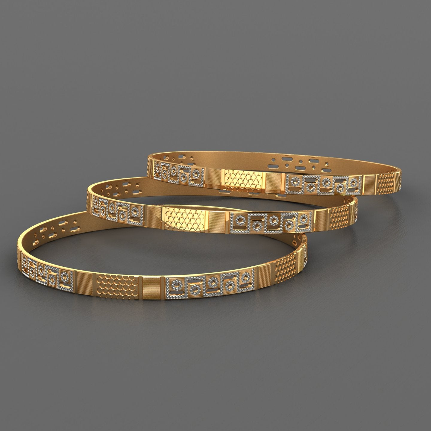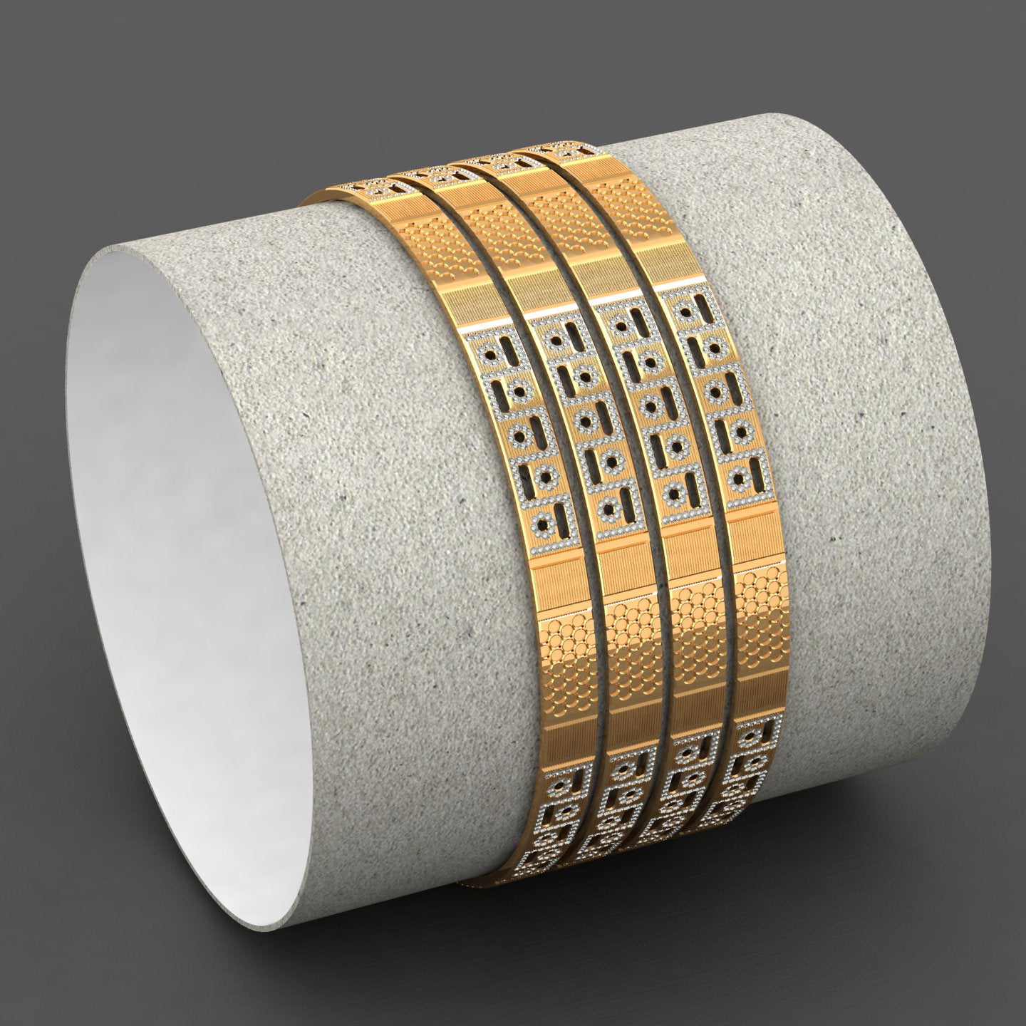 Set of Four 24 Carat gold-plated handcrafted bangles, each has an intricate textured pattern, slip-on closure