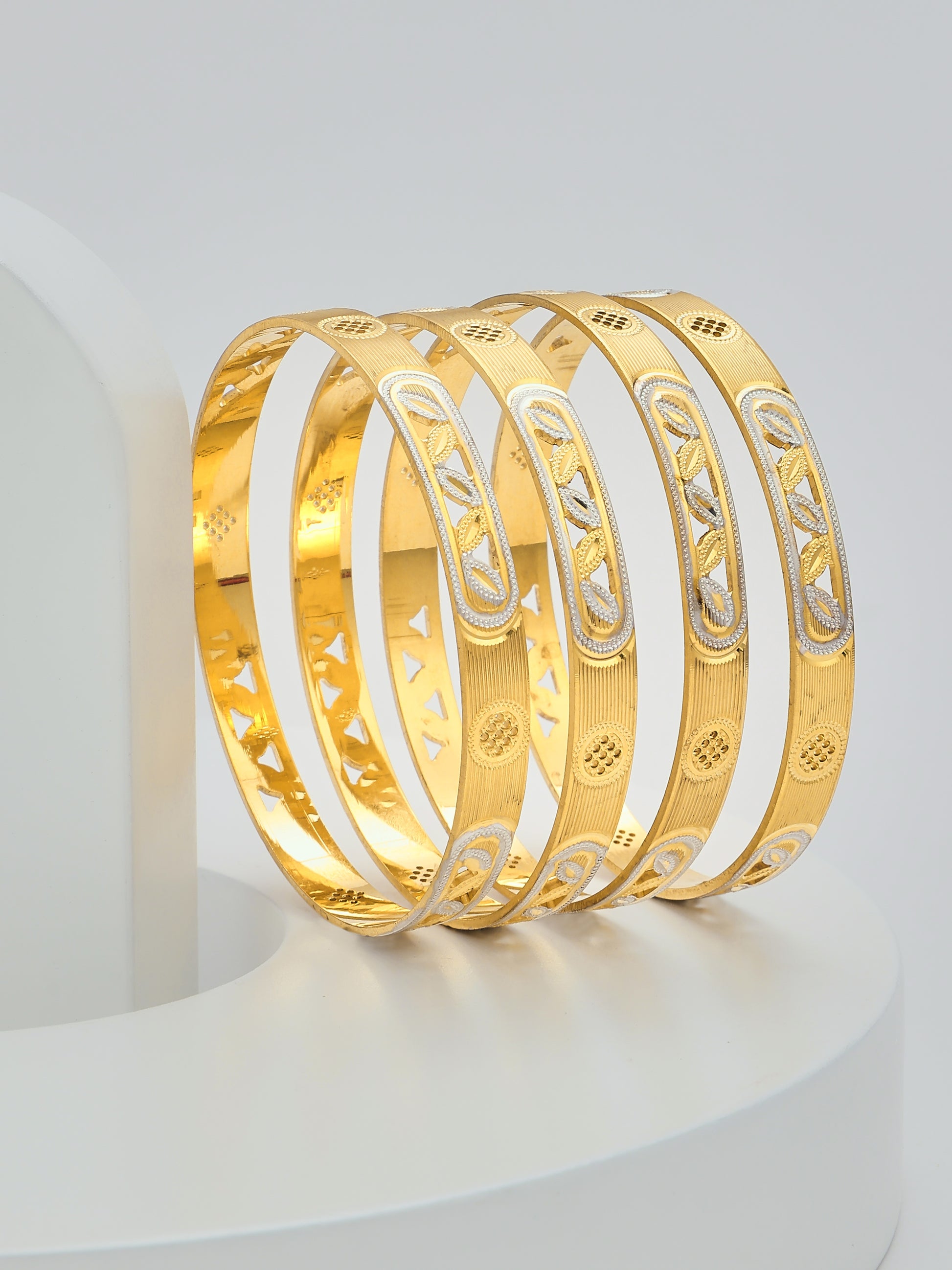 Set of Four 24 Carat gold-plated handcrafted bangles, each has an intricate textured pattern, slip-on closure