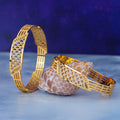 Perfect for daily wear or special moments, this set of two gold-plated bangles features a subtle yet intricate textured design that complements any outfit. Crafted from brass with elegant 24-carat gold plating, these bangles offer lasting shine and comfort. The easy slip-on closure makes them a go-to accessory for effortless elegance.