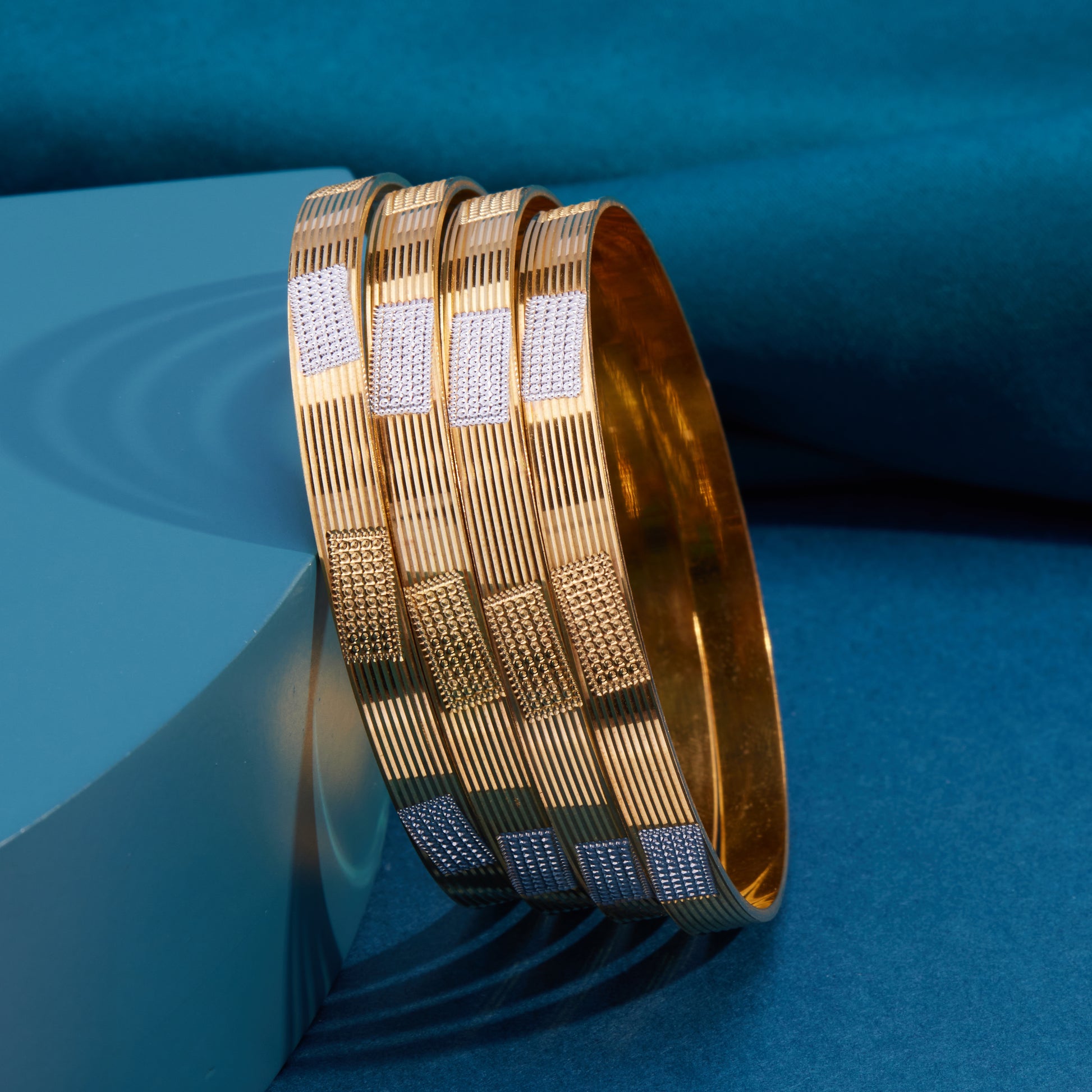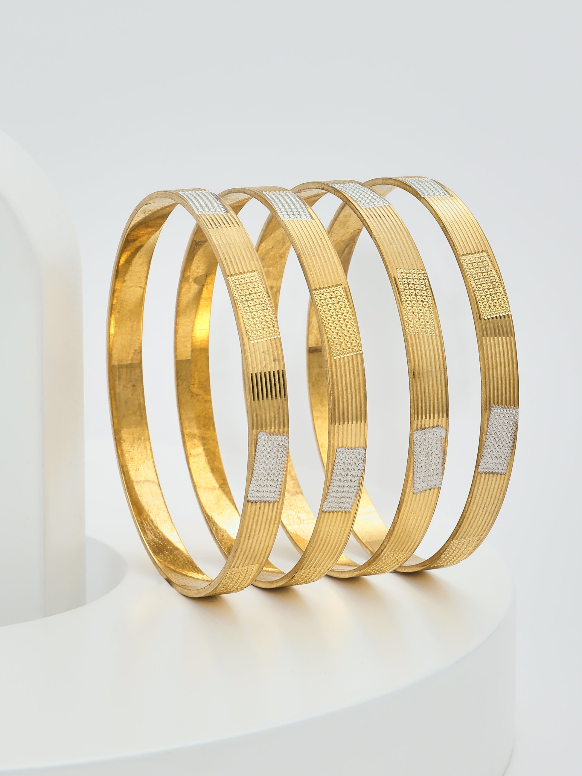 Set of Four 24 Carat gold-plated handcrafted bangles, each has an intricate textured pattern, slip-on closure