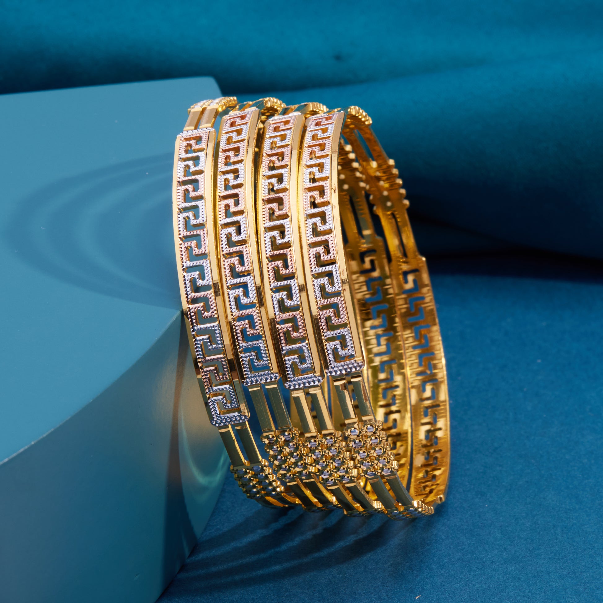 Set of Four 24 Carat gold-plated handcrafted bangles, each has an intricate textured pattern, slip-on closure