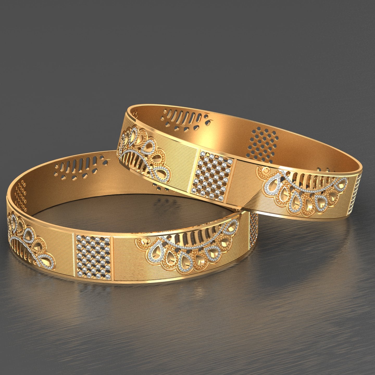 Set of Two 24 Carat gold-plated handcrafted bangles, each has an intricate textured pattern, slip-on closure
