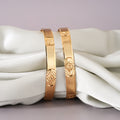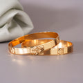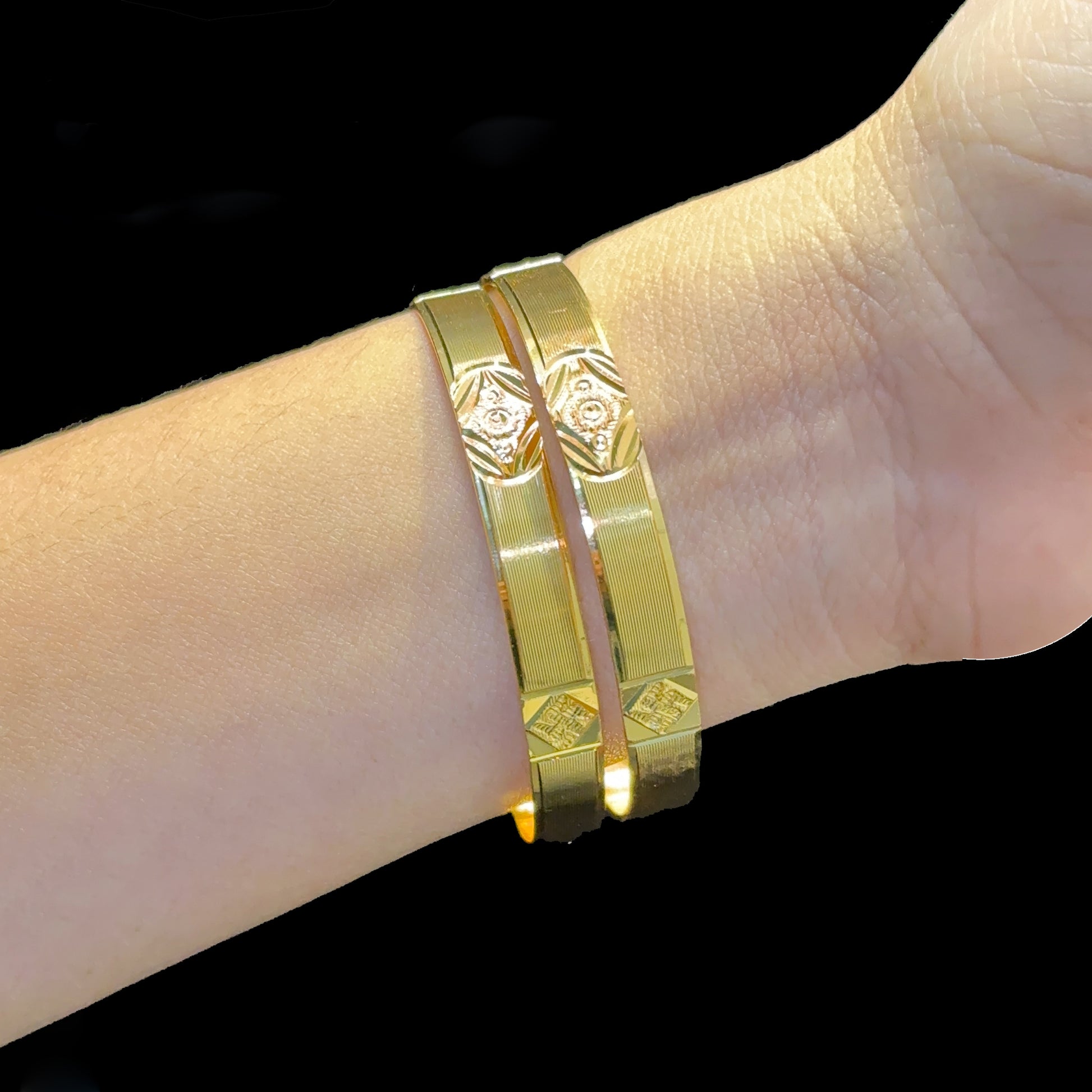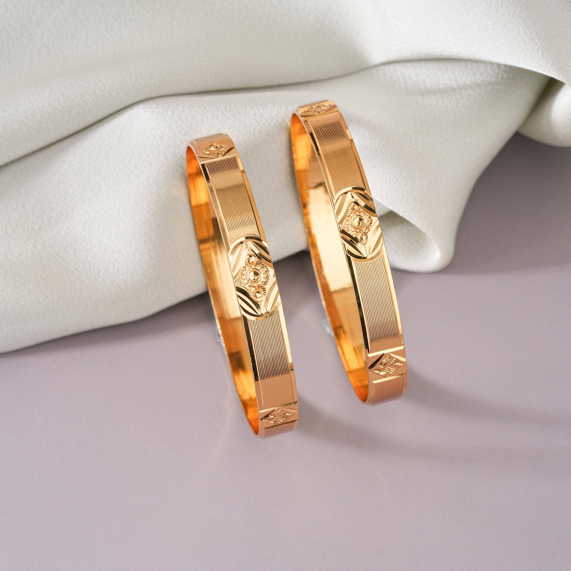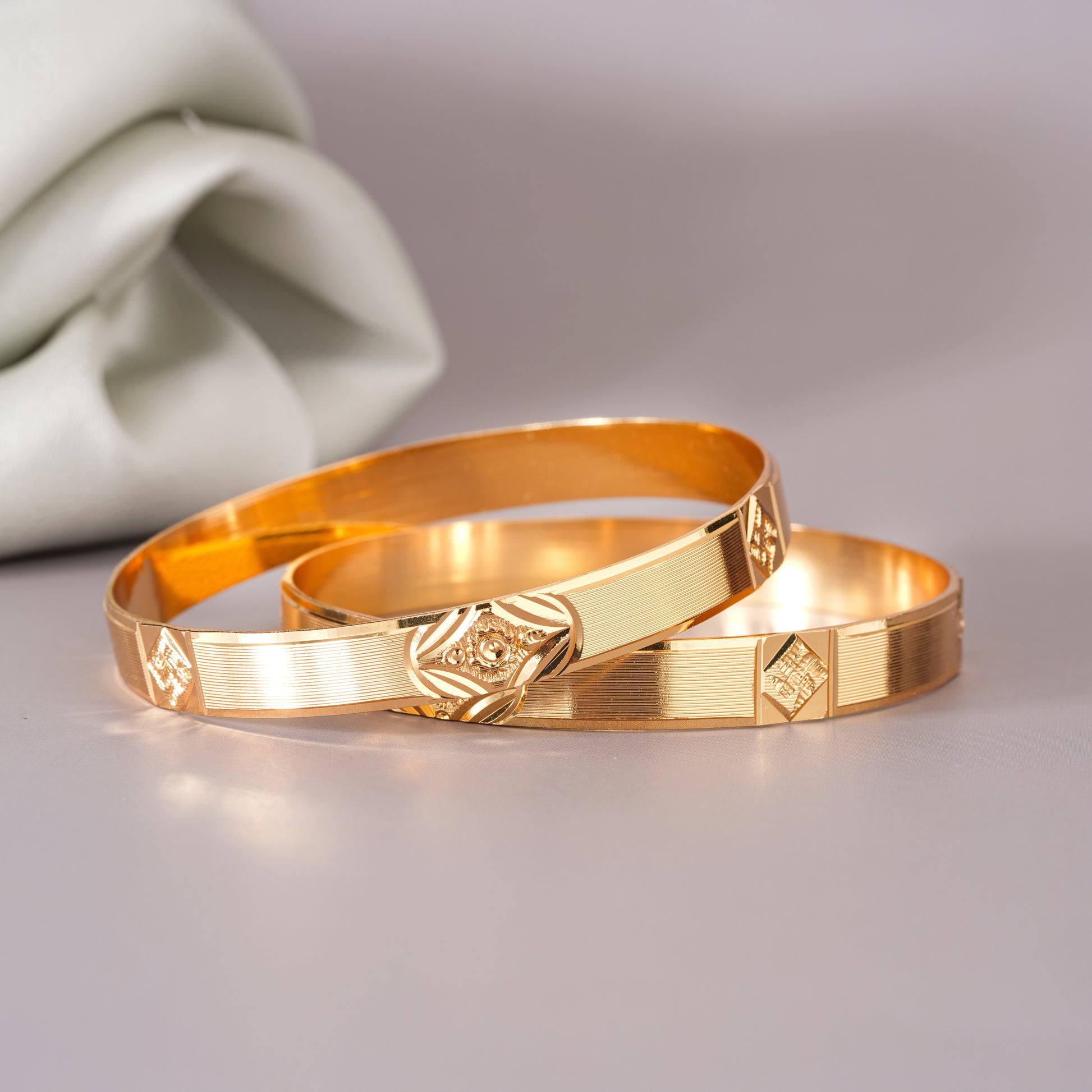 Perfect for daily wear or special moments, this set of two gold-plated bangles features a subtle yet intricate textured design that complements any outfit. Crafted from brass with elegant 24-carat gold plating, these bangles offer lasting shine and comfort. The easy slip-on closure makes them a go-to accessory for effortless elegance.
