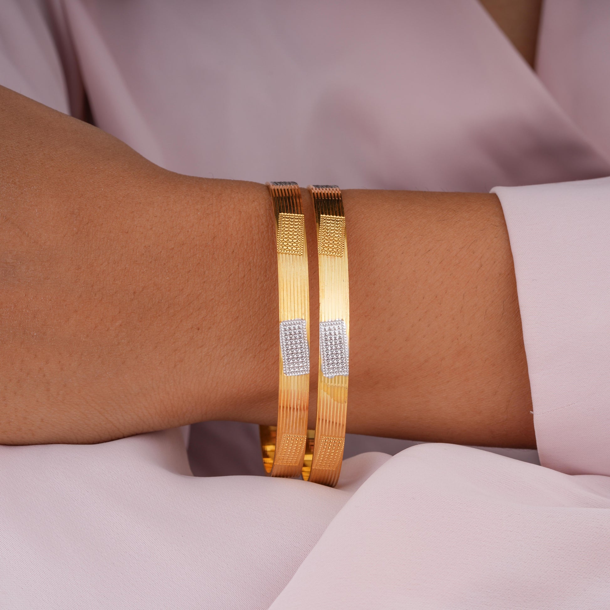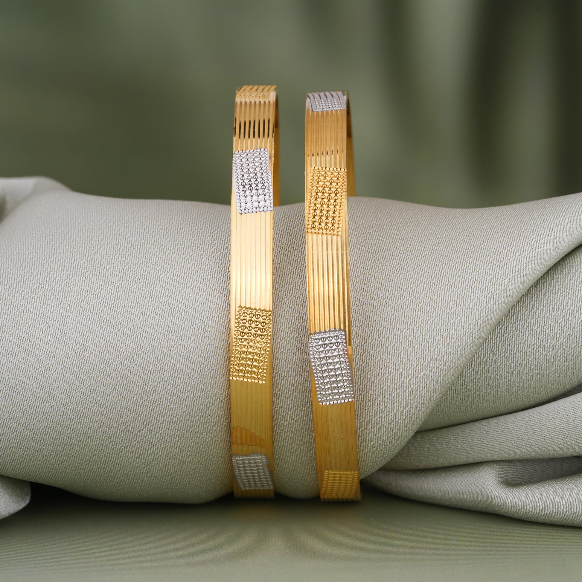 Perfect for daily wear or special moments, this set of two gold-plated bangles features a subtle yet intricate textured design that complements any outfit. Crafted from brass with elegant 24-carat gold plating, these bangles offer lasting shine and comfort. The easy slip-on closure makes them a go-to accessory for effortless elegance.
