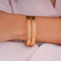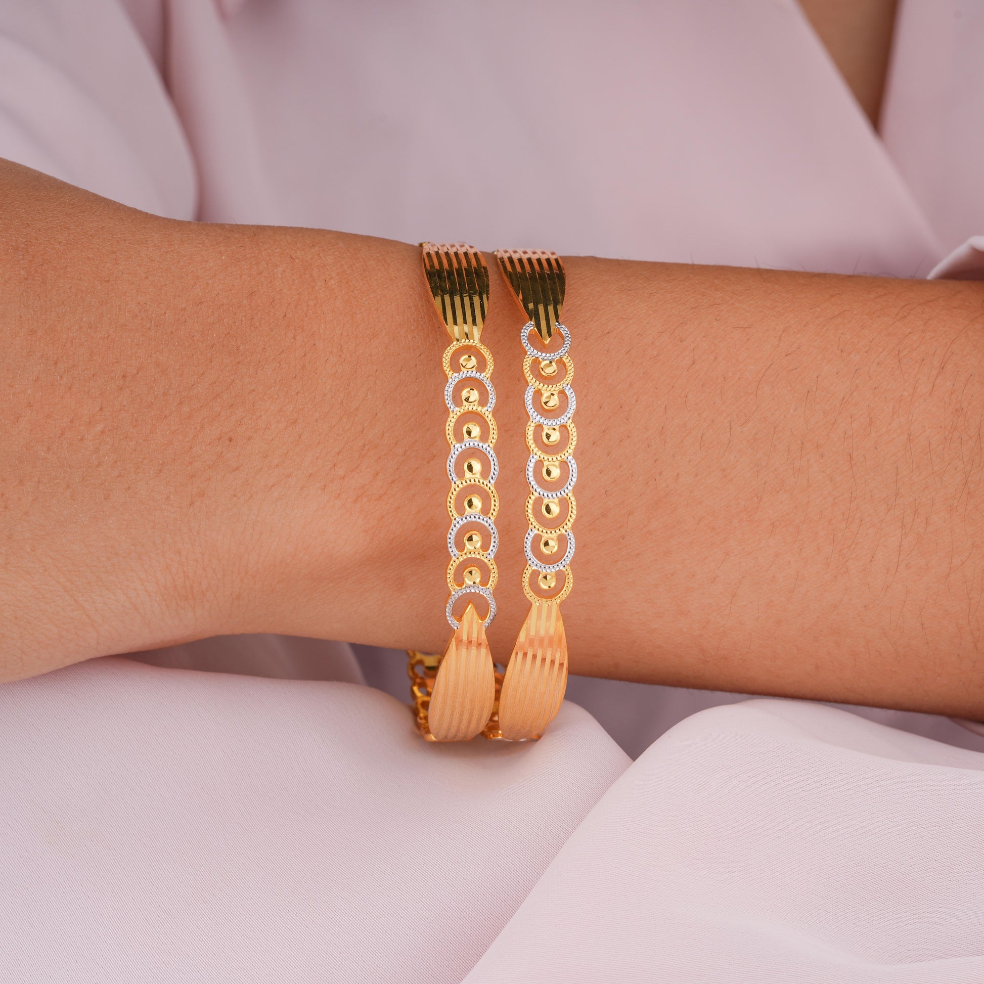 Perfect for daily wear or special moments, this set of two gold-plated bangles features a subtle yet intricate textured design that complements any outfit. Crafted from brass with elegant 24-carat gold plating, these bangles offer lasting shine and comfort. The easy slip-on closure makes them a go-to accessory for effortless elegance.